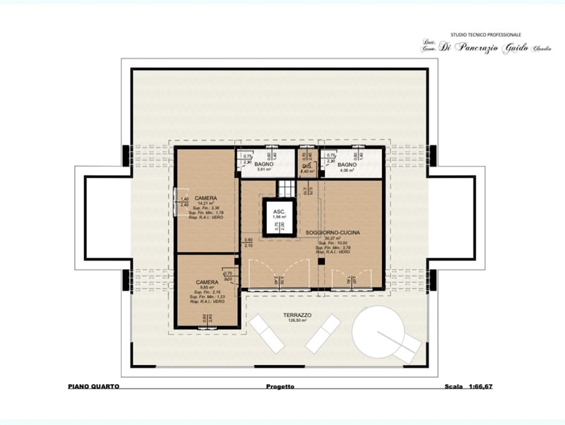 Esclusivo attico con ascensore che sbarca direttamente su sala living, angolo cottura, 2 camere matrimoniali e 2 bagni sviluppa circa 80mq più 130 mq di terrazzi con zona relax benessere, predisposizione vasca idromassaggio e doccia.