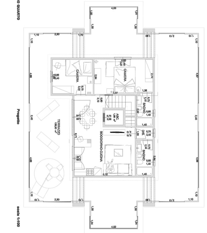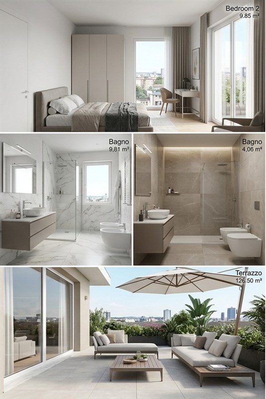 Esclusivo attico con ascensore che sbarca direttamente su sala living, angolo cottura, 2 camere matrimoniali e 2 bagni sviluppa circa 80mq più 130 mq di terrazzi con zona relax benessere, predisposizione vasca idromassaggio e doccia.